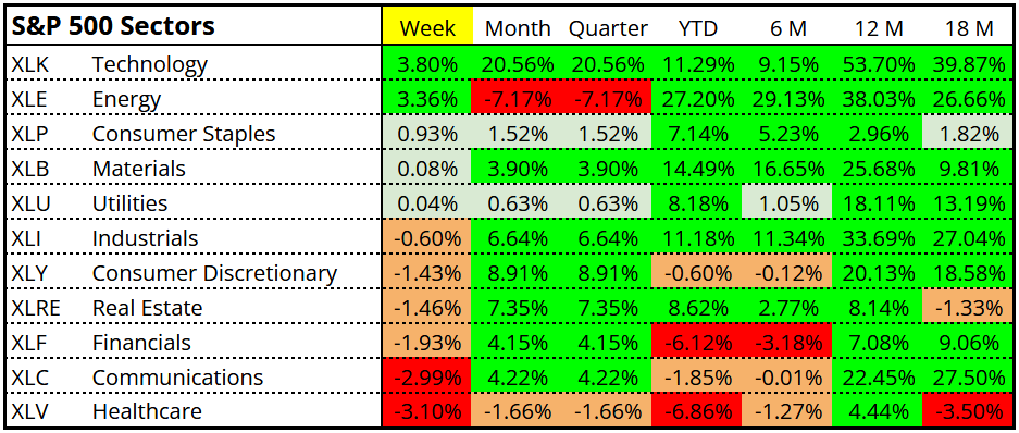 Below the surface, price action was mixed, with technology (AI-driven) and energy (Iran war) leading.