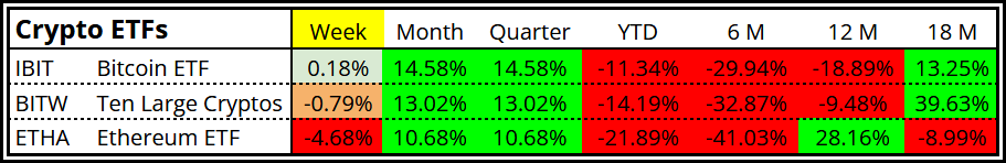 Crypto was mixed. The Ten Large Cryptos (BITW) have been added for better visibility.