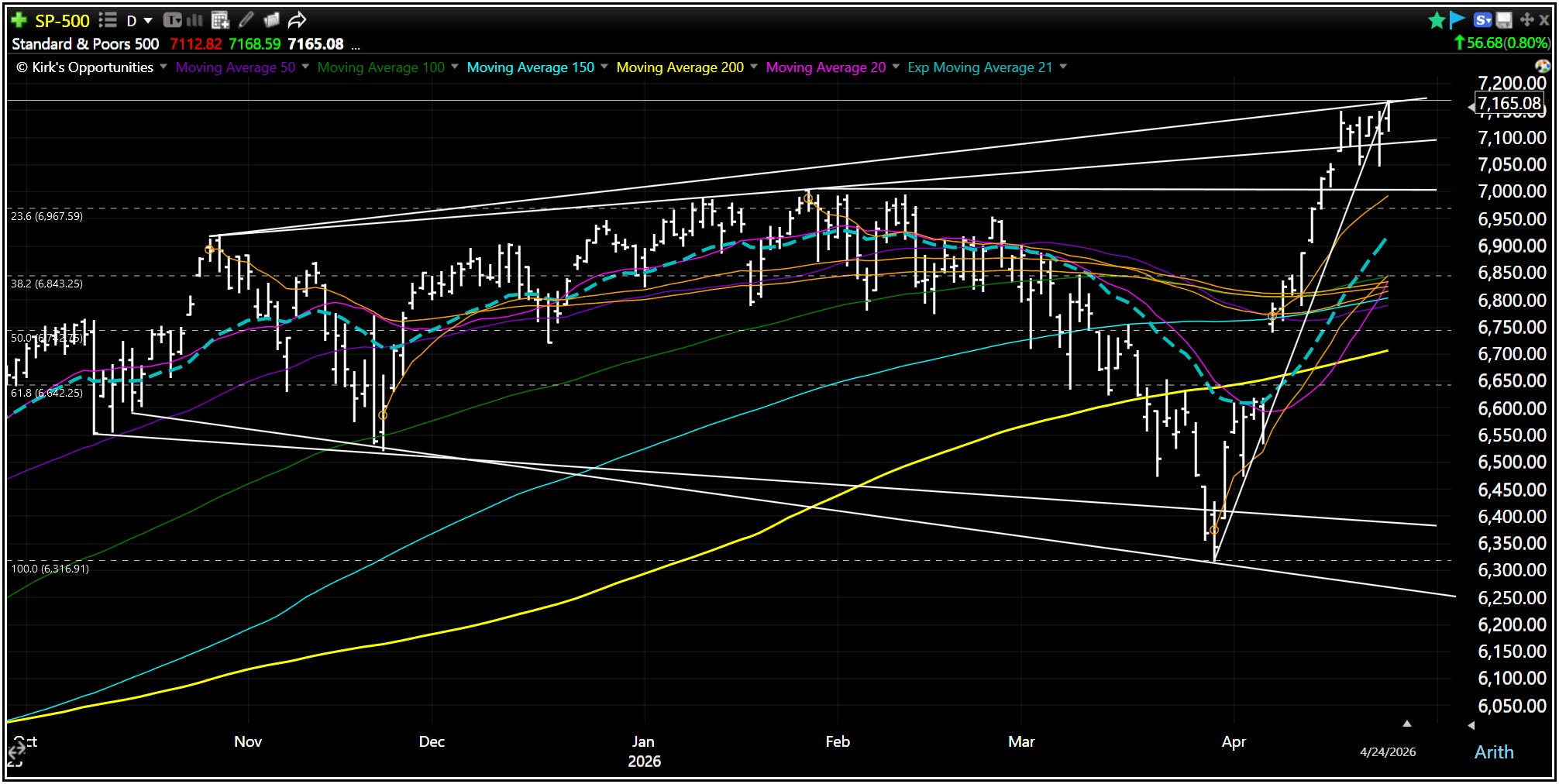 All things considered, this is the most bullish outcome: a breakout with strong, sustained follow-through toward S&P 7425 (Fibonacci extension) and 7459 (prior range breakout), or +3.6% to +4.1% higher.