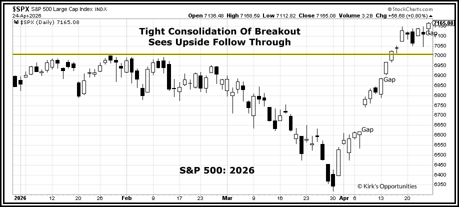 The consolidation was shallow and brief, reinforcing resilience with no sign of a bull trap or throwback at new highs. The S&P 500 closed at another all-time high, up +9.75% for April and +4.7% year-to-date.