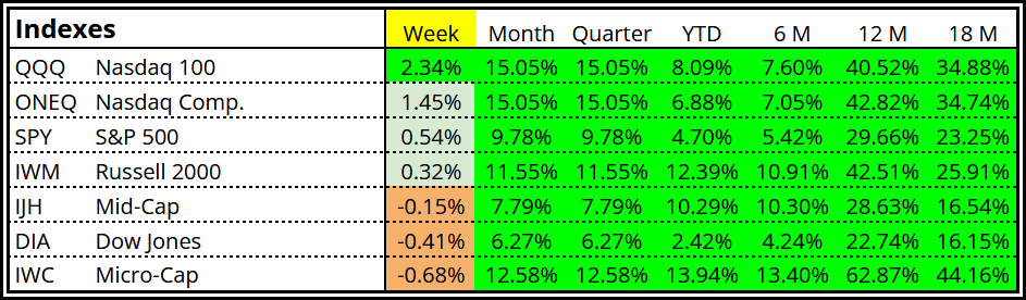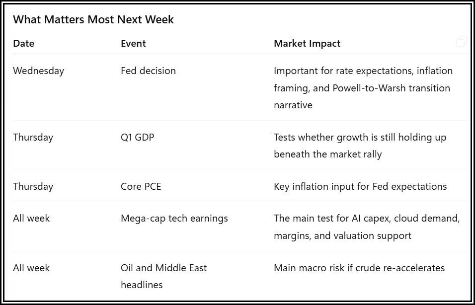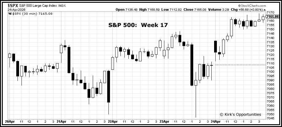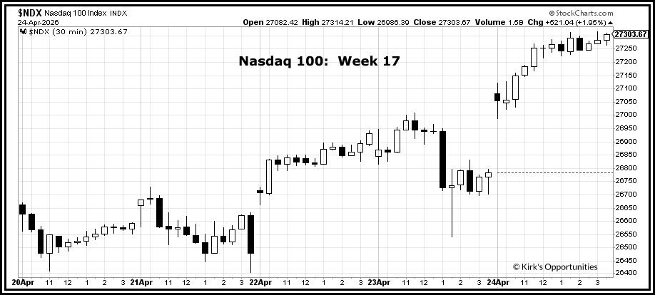 Meanwhile, the Nasdaq 100 continues to lead and closed at a new high. It was up +2.4% last week, +15% for April, and +8.1% for 2026.