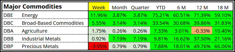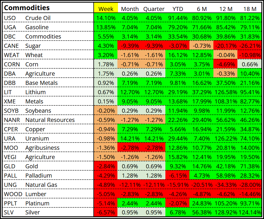 Energy commodities led, with strong gains in oil and gasoline.
