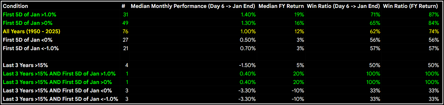 When the first five days are positive and up +1%, the forward performance has been positive with an 87% win ratio and median full year return of +19%: