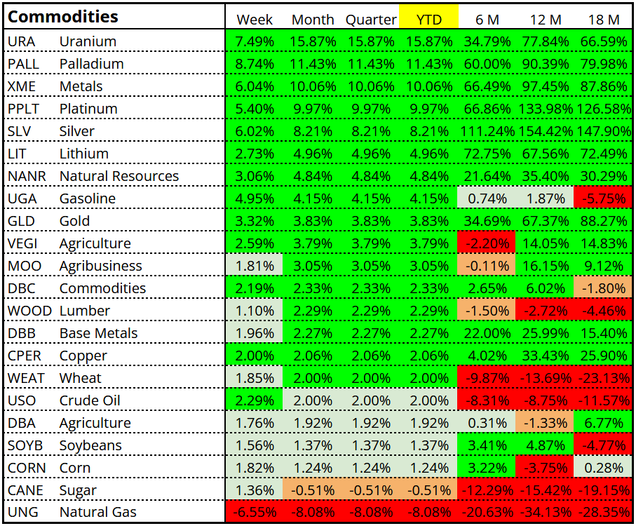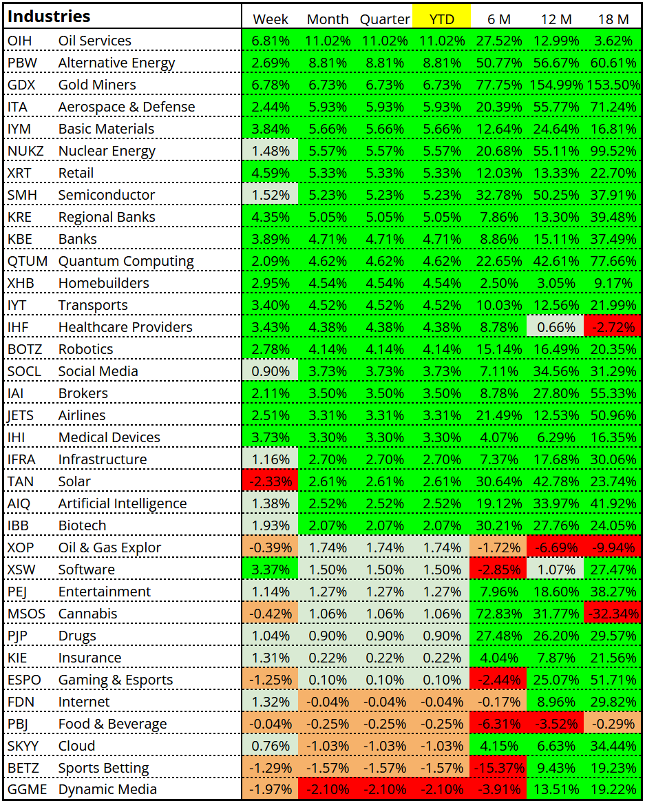 Oil Services, Alternative Energy, Gold Miners, Aerospace & Defense, Nuclear Energy, Retail, Semiconductor & Banks